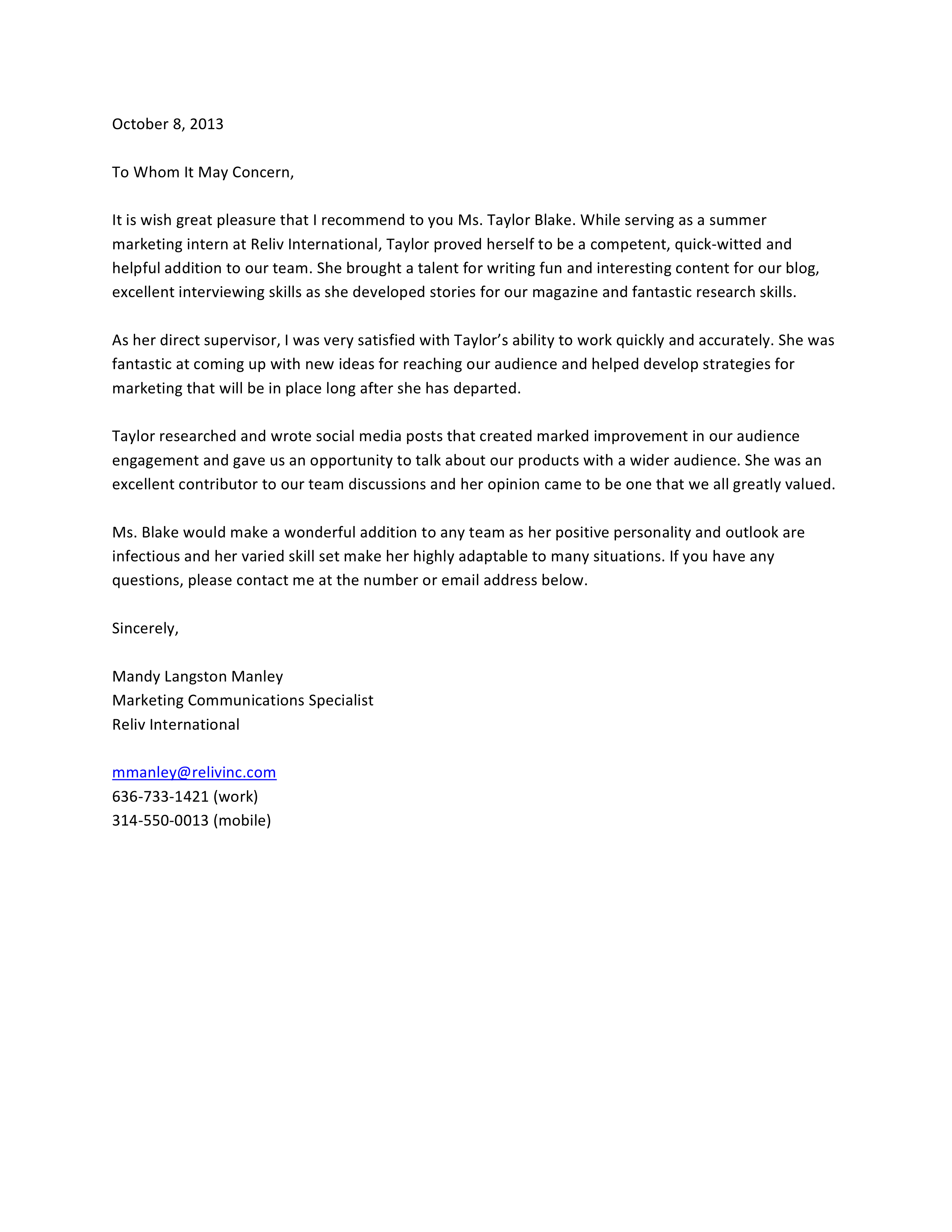 Posted on December 14, 2013April 16, 2017 by taylorlaurenblakeRECOMMENDATION // Mandy Manley Recommendation letter for Taylor Blake from Mandy Manley, Marketing Communications Specialist for Reliv International. Share this: Share on X (Opens in new window) X Share on Facebook (Opens in new window) Facebook Like Loading... Related